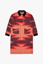 Command attention with the Duster Coat, a striking piece that merges bold design with functional craftsmanship. Featuring an intricate geometric pattern in warm, earthy tones, this long coat embodies rugged sophistication. Accented with a contrasting black corduroy collar and polished metal hardware, this standout piece is perfect for layering and turning heads. The extended silhouette and snap-button closure evoke a classic Western-inspired aesthetic reimagined for modern streetwear.