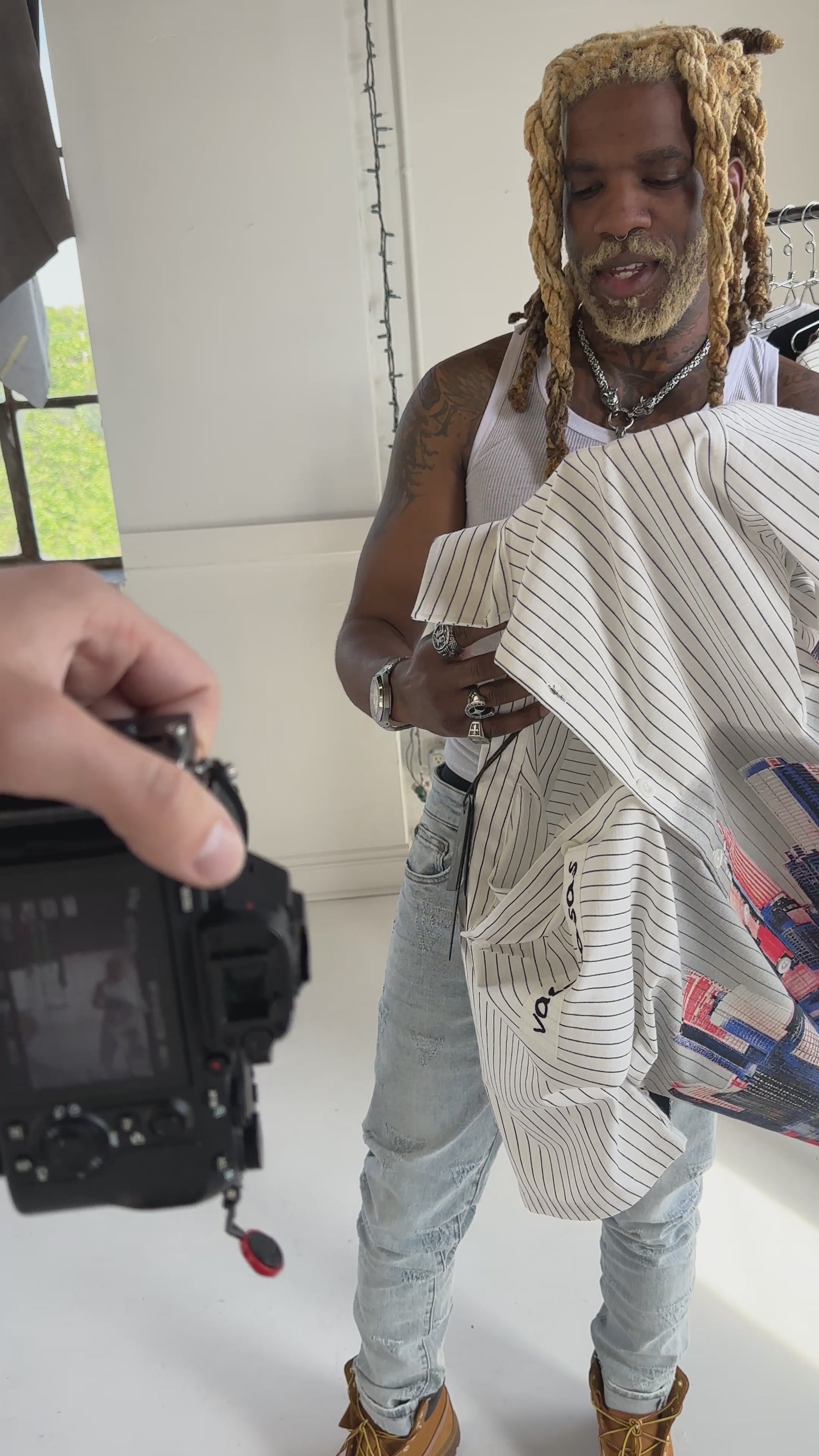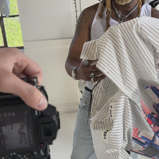 Crafted in a white pin-striped fabric, the shirt features a detailed cityscape graphic across the lower half, adding depth and movement to the design. A subtle Valabasas script detail at the chest balances the composition, blending minimal branding with standout artwork.
